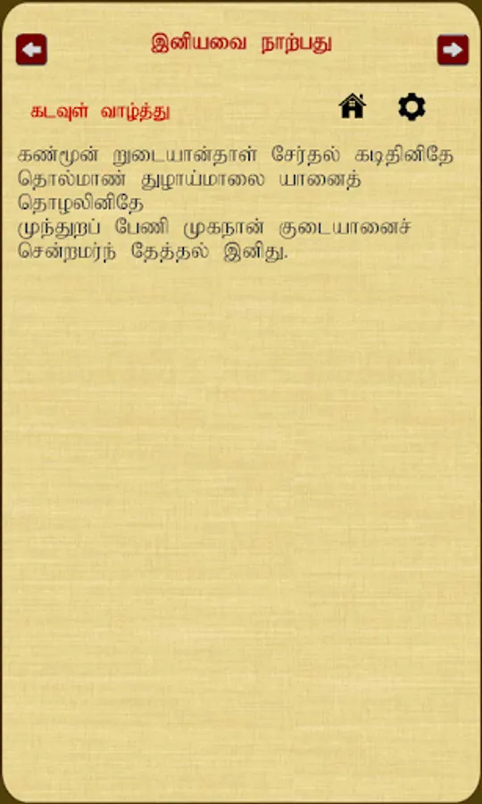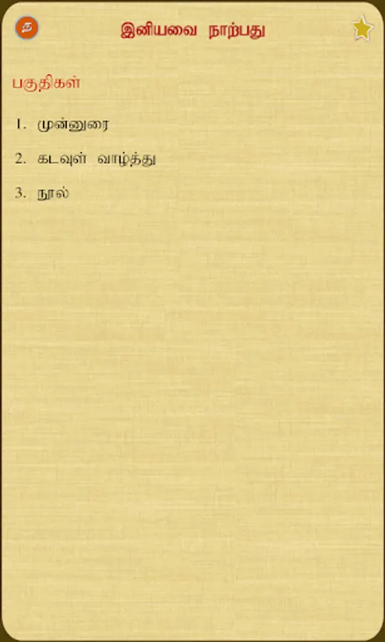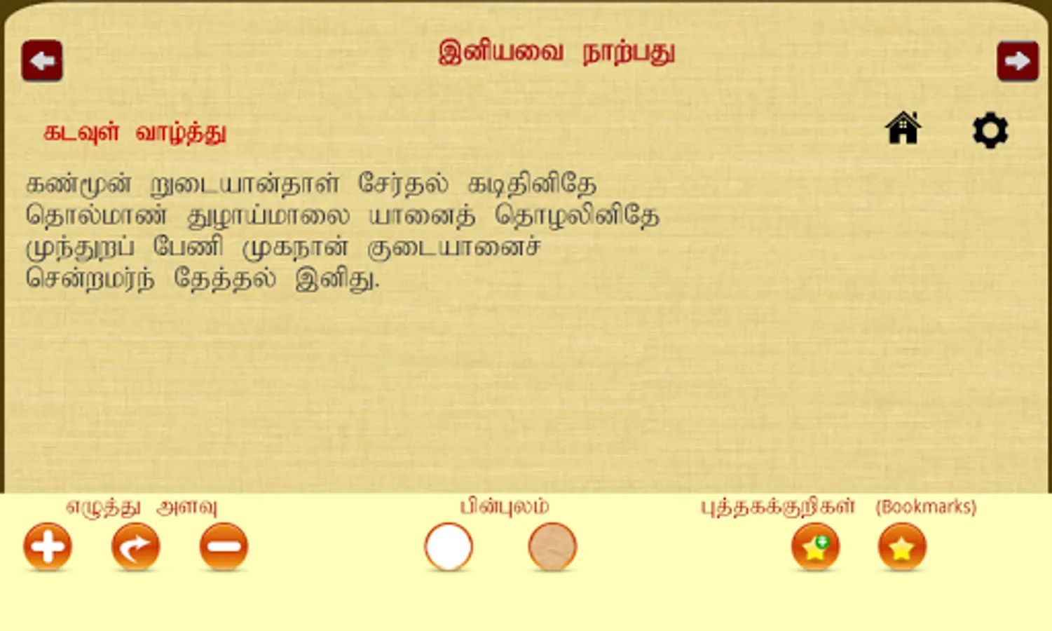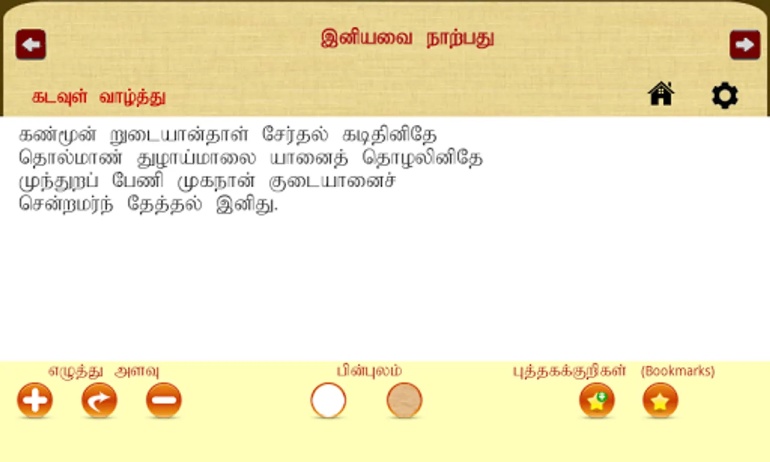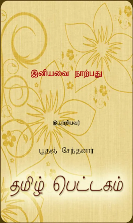 Iniyavai Narpathu - Iniyavai Narpathu is a Tamil poetic work of didactic nature belonging to the Pathinenkilkanakku anthology of Tamil literature. This belongs to the 'post Sangam period corresponding to between 100 – 500 CE. Iniyavai Narpathu is a collection of 40 poems written by the poet Putham Sernthanar describing the most desirable things in life. The poems of Iniyavai Narpathu are written in the Venpa meter.