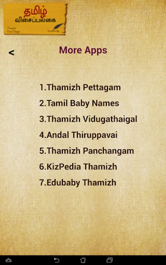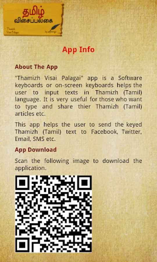 "Thamizh Visai Palagai" app is a Software keyboards or on-screen keyboards helps the user to input texts in Thamizh (Tamil) language. It is very useful for those who want to type and share thier Thamizh (Tamil) articles etc.