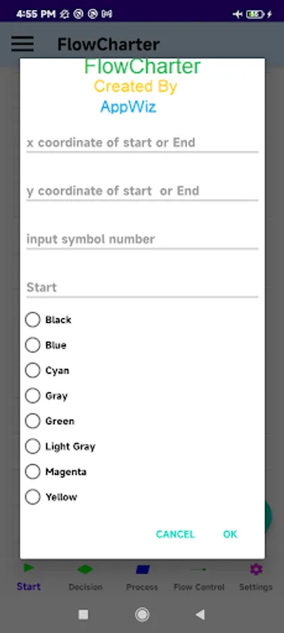 FlowCharter provides 10 building blocks/Symbols +1 user-defined block/symbol. It enables you to show actions, materials, or services entering or leaving the process (inputs and outputs), decisions that must be made, people who become involved, time involved at each step, and/or process measurements.