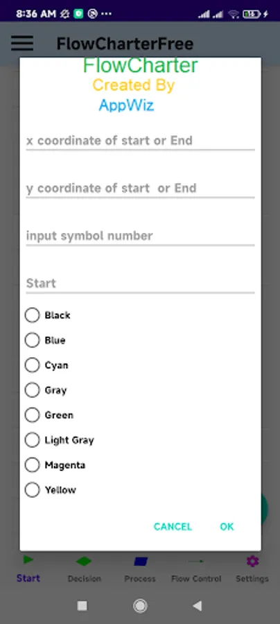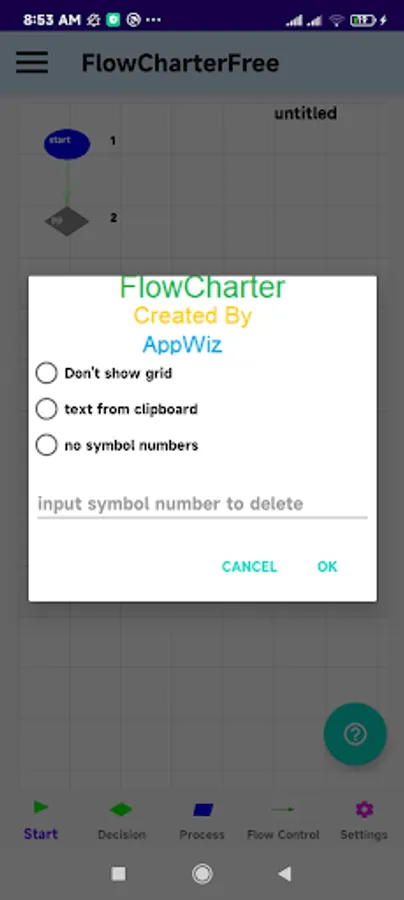 FlowCharterFree provides 10 building blocks/Symbols +1 user-defined block/symbol. It enables you to show actions, materials, or services entering or leaving the process (inputs and outputs), decisions that must be made, people who become involved, time involved at each step, and/or process measurements.