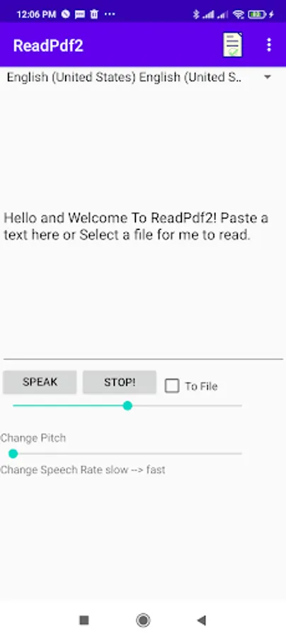 ReadPdf2 is a Text to Voice Converter app that will read aloud any text file on your device. It can read out from a PDF file with the help of a built in text extractor. No need to type. Read aloud text or pdf files on your device. File selector enables you to select the file to read. Language selector enables language selection. Supports reading large pdf files by splitting the tts files.