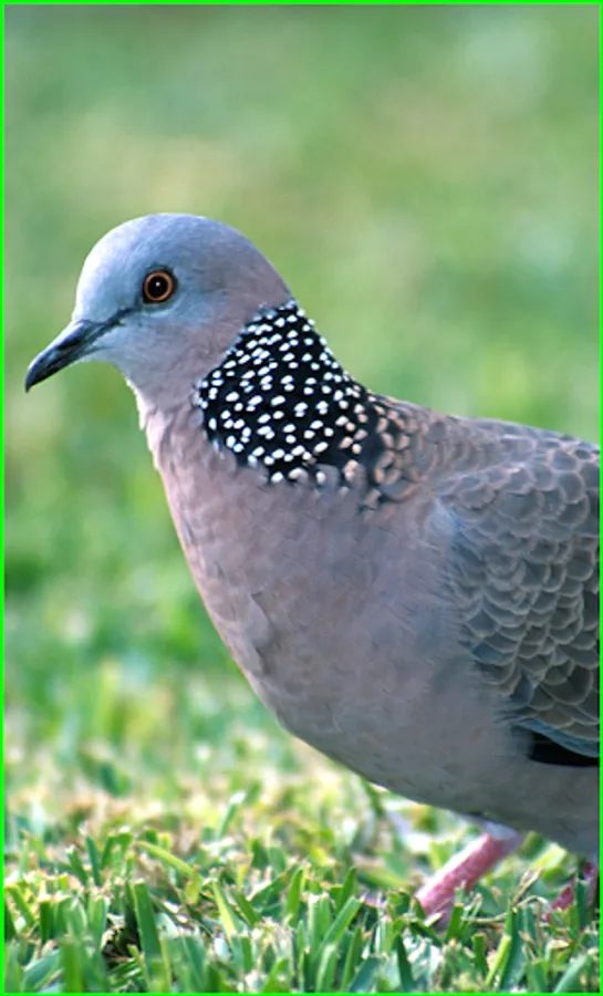 Spotted dove (Spotted dove) is a bird with a long tail 28-32 cm long, slender body with a reddish brown. Black feather wings with a fringe of gray inside. And the lower part is gray. A black stripe, white spots on the back of the neck, which is not found in the young bird sings low the red legs. "Wook - wook - the teacher" or "Wook - Wook moment, prison" spotted dove eat whole grains as food. He lives in the sparse fields where crops are cultivated. Often in pairs and comedy duo in the morning cold. Often comes down to living under the ground. Time to tighten pleasant voice Pet birds are popular this kind widely. During the breeding season is during the months of May-June. Nest on trees On the contrary branches intertwine, making the basin to spawn. Typically lay 2-3 eggs have spotted dove habitat in southern Asia from Pakistan, India and Sri Lanka east to southern China and Southeast Asia.