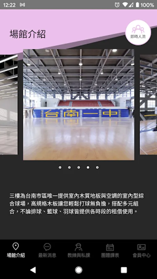 體育館一樓空間為專業的健身空間,除提供專業教學以外,使用的設備也北美最高等級設備,讓各層級運動者健身無負擔,用最適合身體的舒適角度進行訓練。 二樓空間為桌球館與各類體適能課程教室空間,我們有四間專業的綜合教室:體適能教室、飛輪教室、瑜珈教室、有氧教室。 三樓為台南市區唯一提供室內木質地板與空調的室內型綜合球場,高規格木板讓您輕鬆打球無負擔,搭配多元組合,不論排球、籃球、羽球皆提供各時段的租借使用。