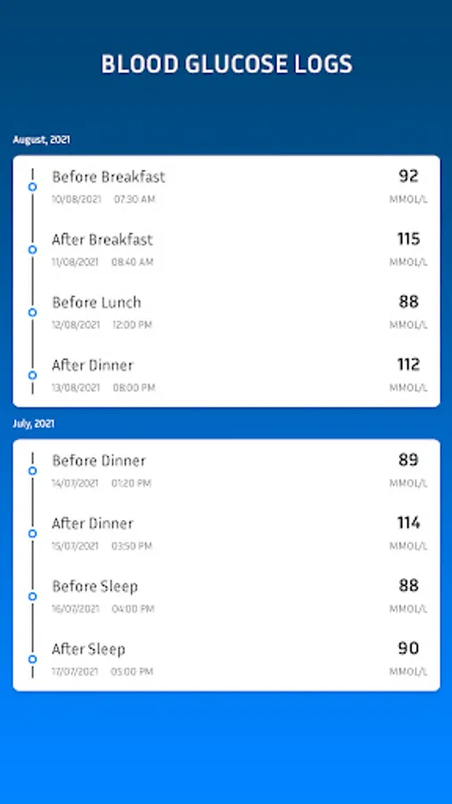 ▌Blood Glucose Level: The amount of glucose present in your blood is your blood glucose level. Basic blood sugar tracking by type of event (before breakfast, before dinner, after lunch, etc.)