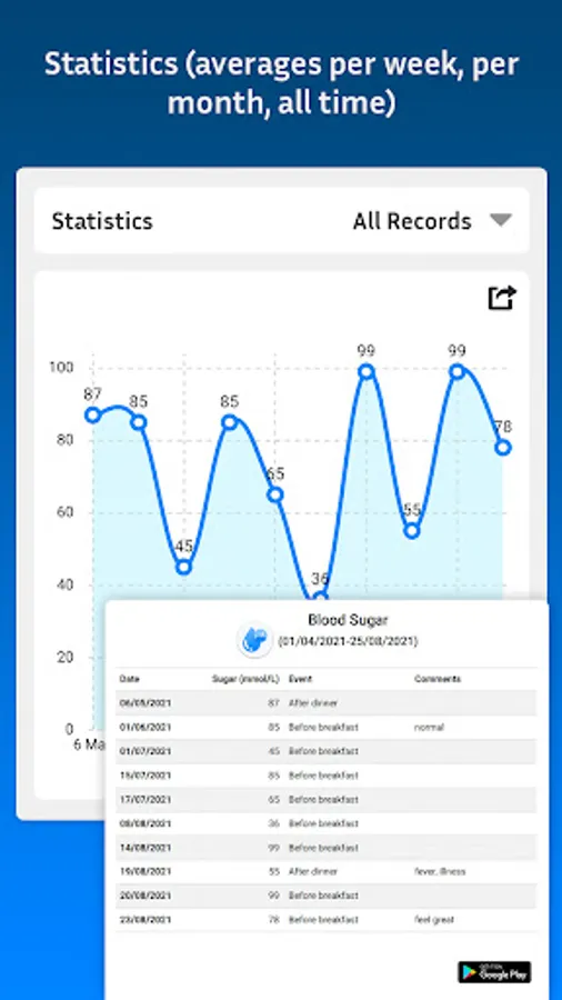 - Track your blood glucose levels by time.
