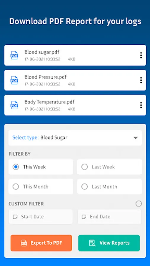 - Export PDF Reports and share with your families and doctors