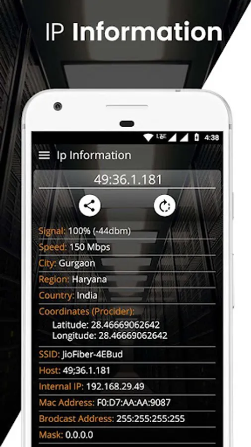 Network Tools has a simple interface, enabling you to receive full information on your network, find out internal or external IP, SSID, BSSID, broadcast address, gateway, network mask, DNS Lookup, country, region, city, the provider’s geographical coordinates (latitude and longitude) and other basic information such as DHCP and DNS server information.