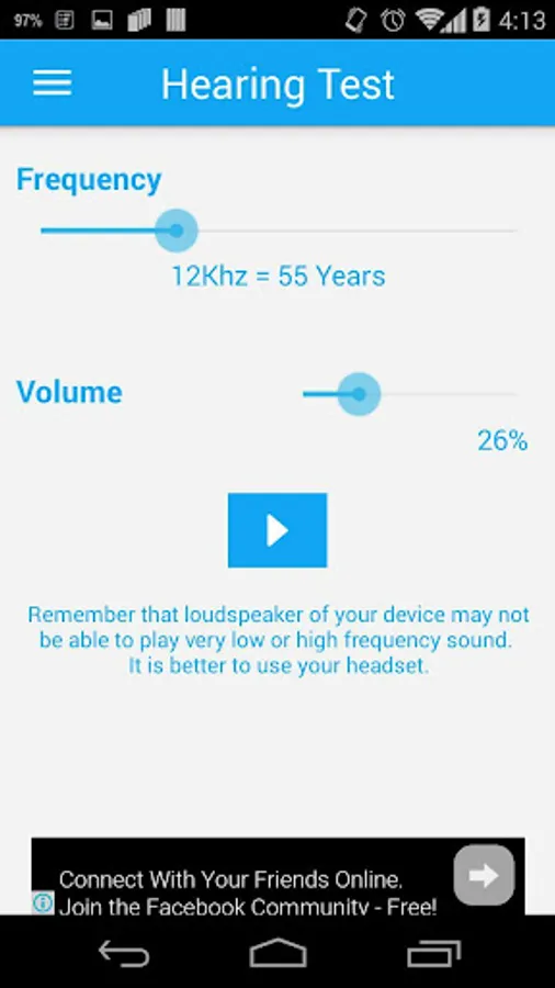 Hearing Test allows user to test his/her hearing or listening ability with respect to age.