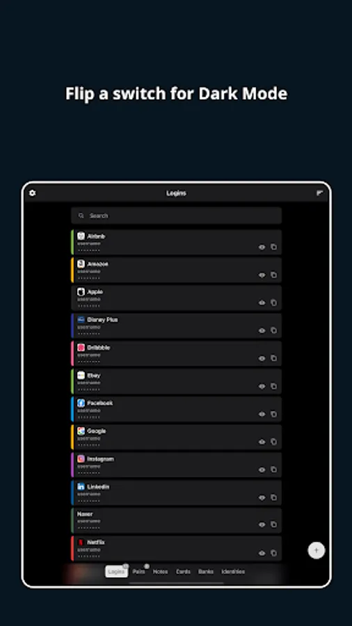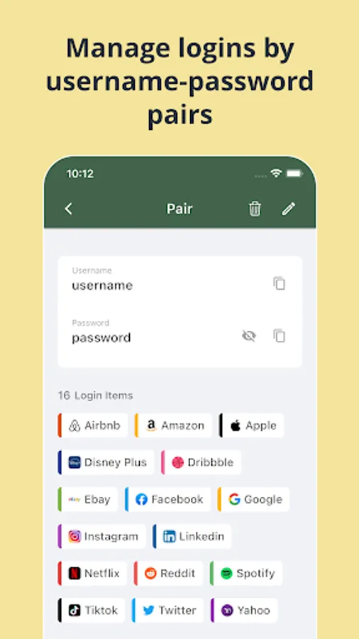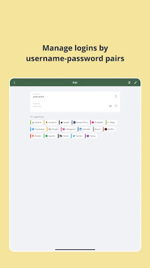 Pairs secures your passwords in an end-to-end encrypted vault. From your vault, you can store passwords, notes, identities, and more.