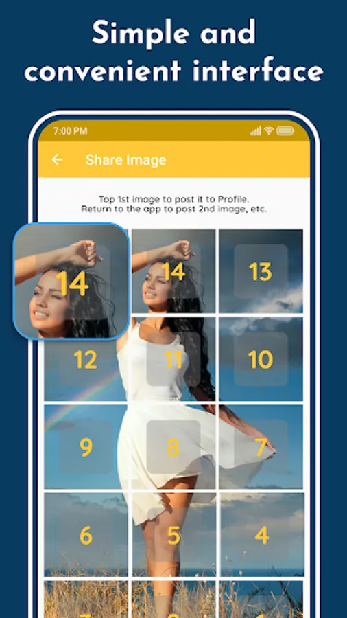 Choose a new picture from the photo gallery; choose a suitable sizing option among the five available options, and let Grid Maker photo split crop the image for you! Then, you have to submit the resulting pics to your Profile in the order suggested by the app. You don't even have to save the tiles to your device as sharing to 15 Square Grid Maker is embedded in the application!