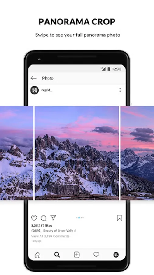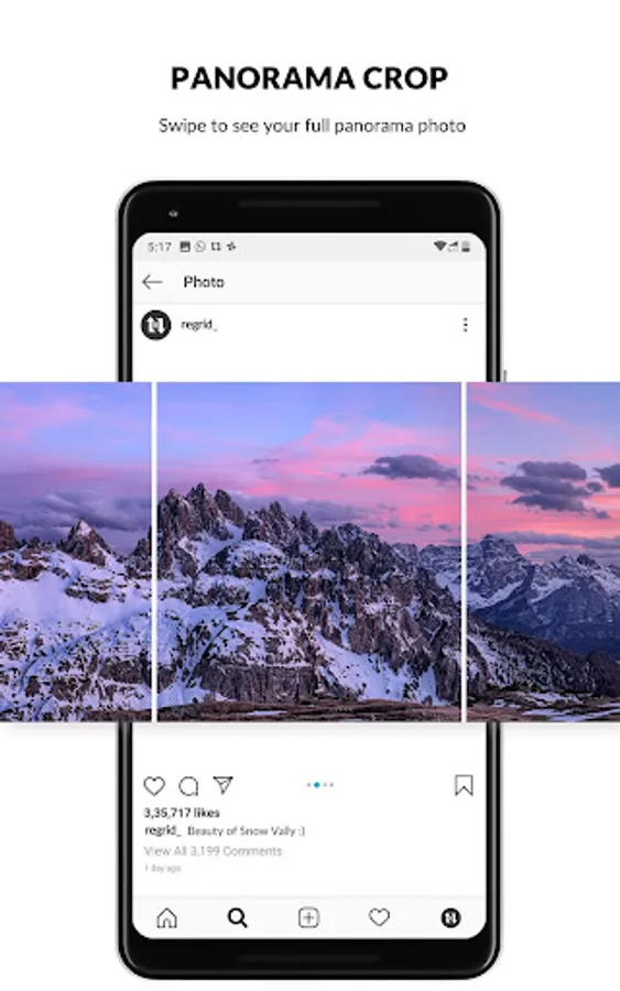 Panorama Crop - Split big panorama photos in to pieces and upload it on instagram. After upload on instagram, just swipe photos, so you can see the full panorama image without crop. Panorama Crop is the best to make your post swipeable.