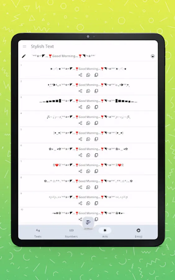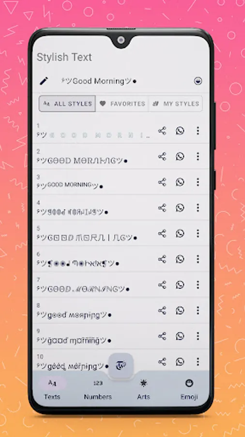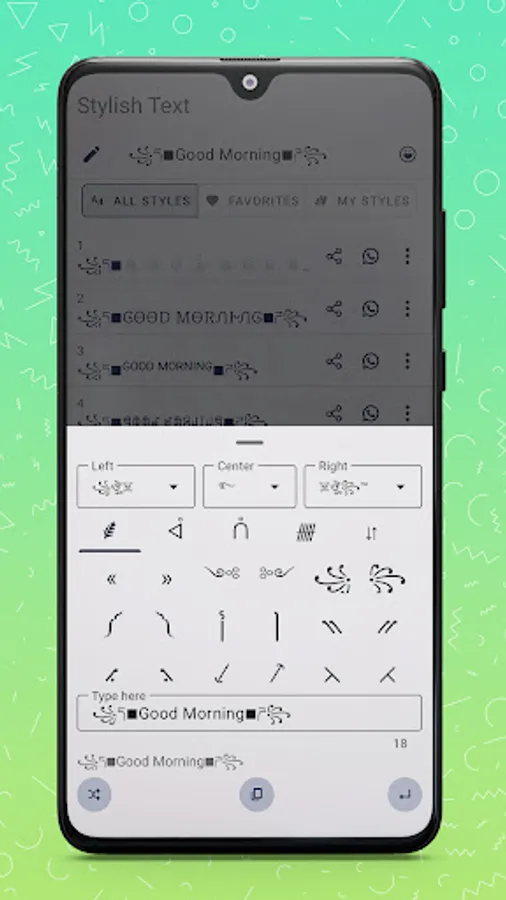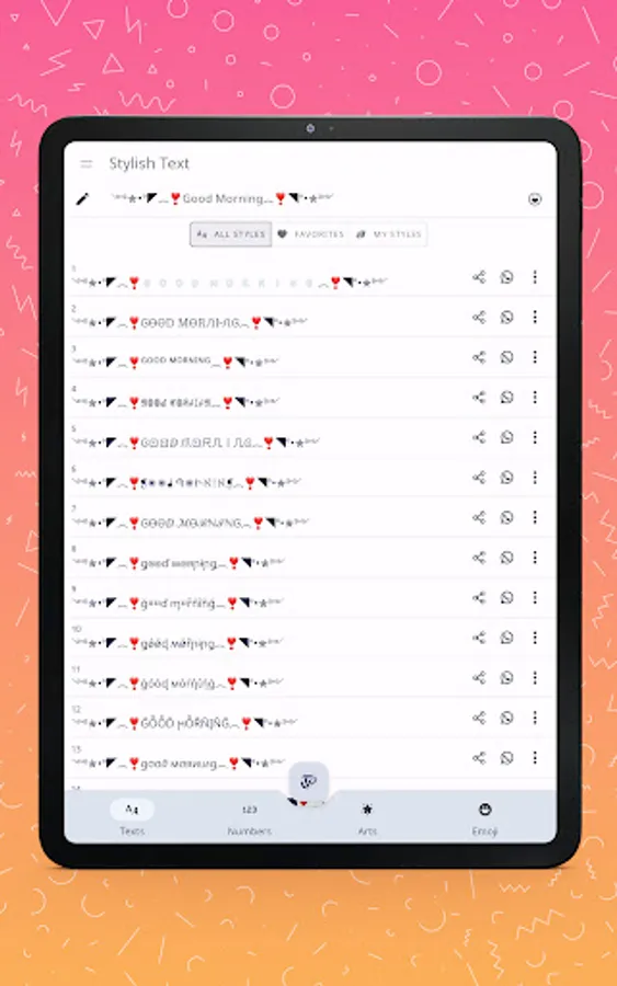 ◆ Choose your favorite font styles and fancy symbols: What makes this free letter style change app stand out in the competition is the variety of available font types and styles to convert your normal text messages to fun and eye-catching styles. This free cool text app comes with hundreds of different artworks and font styles, and the interface is so user-friendly that you will get the whole idea as soon as browsing through the available stylish letters and words.