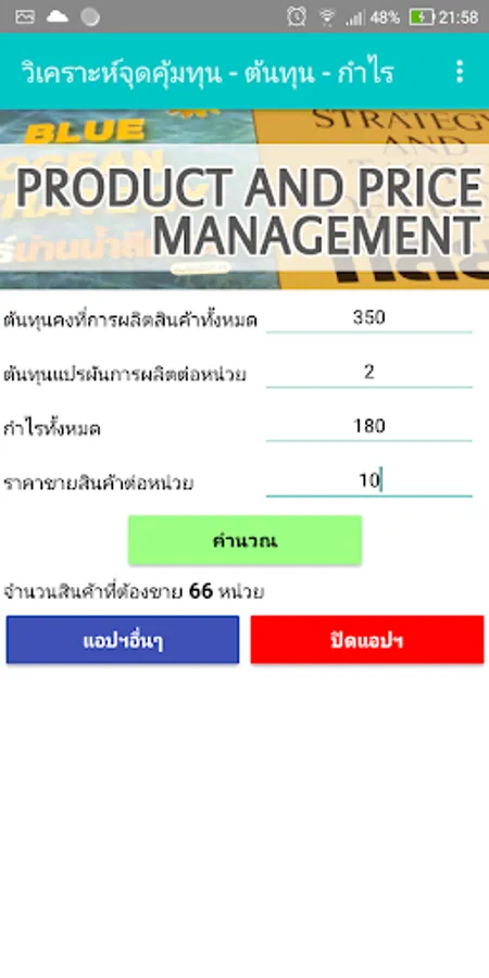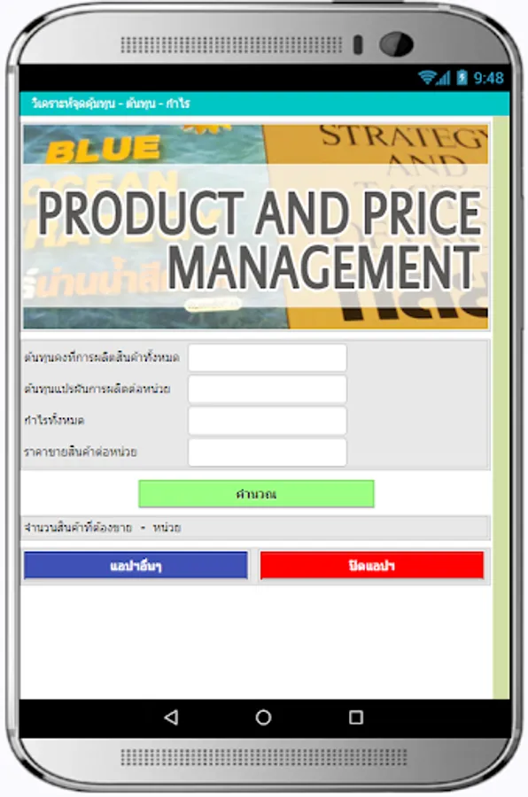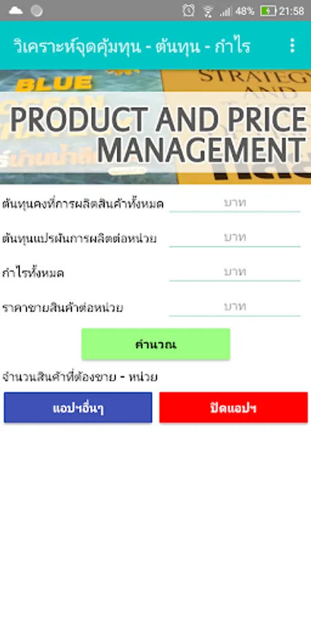 With this application, manufacturers can sell products without loss. Trying to use this application will find that the sale will be more confident because it can determine the selling price. Or set the desired profit Can also specify the fixed cost and variable cost of the product as well Therefore suitable for traders in the market Or a group of users who are villagers