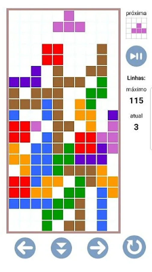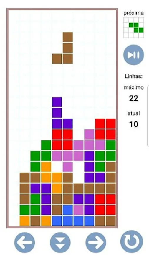 Figures composed of blocks appear at the top of the screen and go down vertically. You can move them to the left or right, or rotate them to fit the figures that accumulate at the bottom of the screen. Each line that is completed disappears and you gain one point. The goal is to make as many points as possible and to spend as much time playing before the pile of figures grows and prevents the arrival of new figures, ending the game. You can choose the falling speed of the figures. You can also choose to play with steady or incremental speed.
