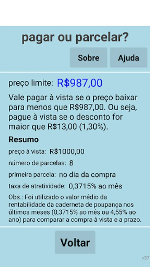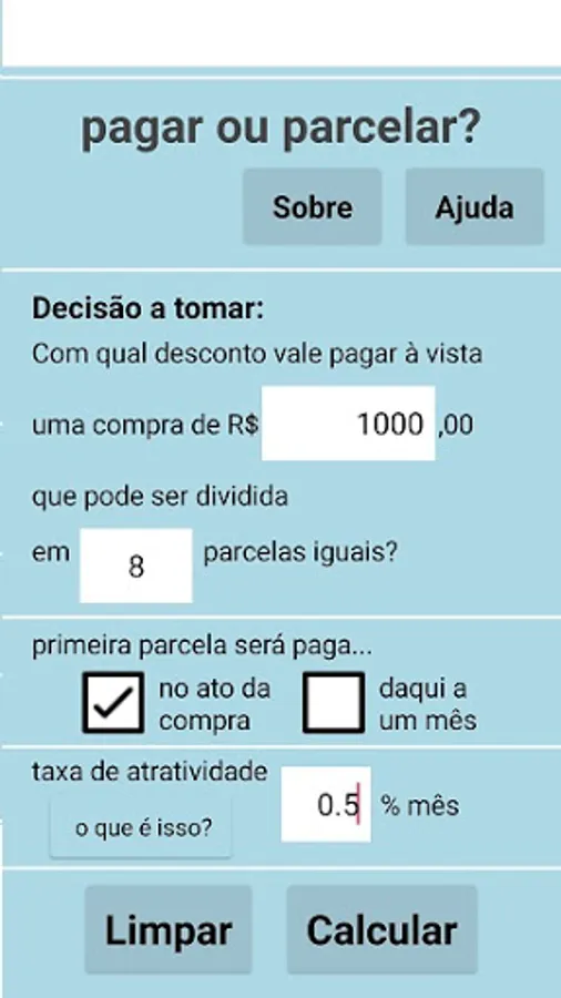 Is it better to buy cash or credit? The app recommends the best solution between buying cash at a discount or interest-free installments. The recommendation takes into account the number of installments, the discount offered on the spot price and the rate of return that the buyer gets for their investments.