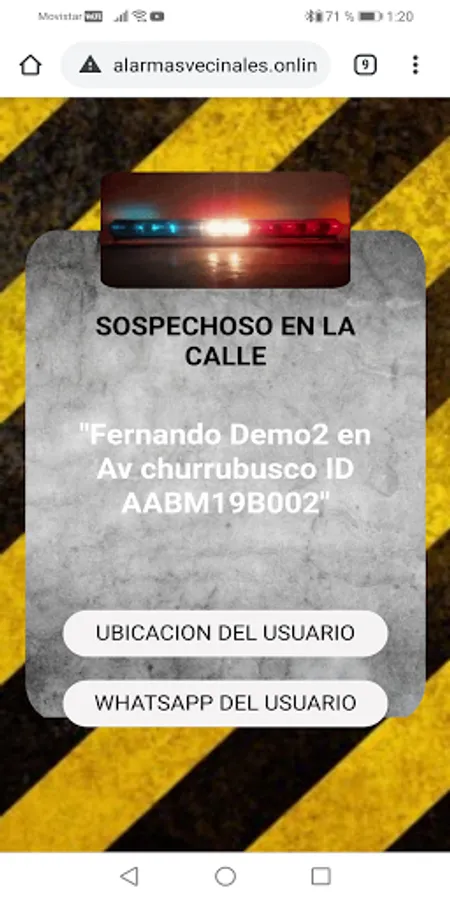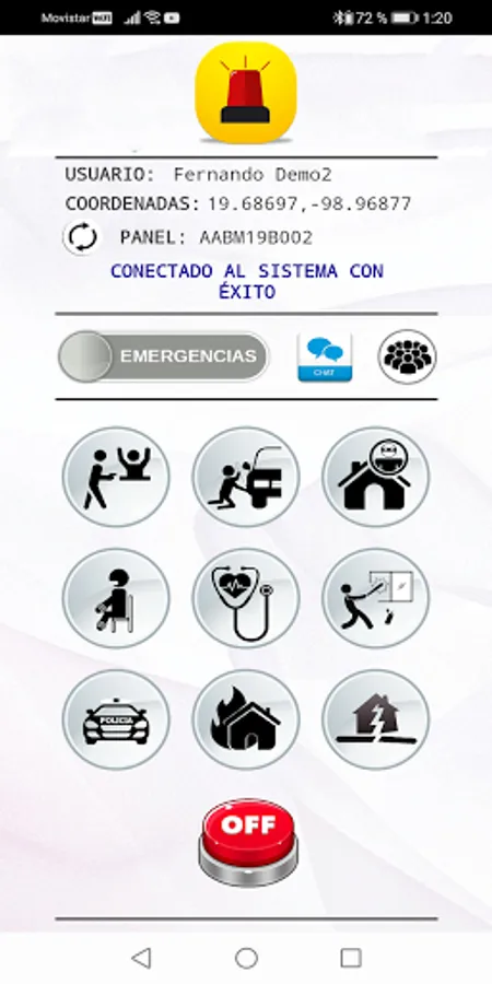 The mobile application has: history of who activated the alarm, location and emergency, 9 types of emergency (they trigger the alarm and notify), 3 panic buttons (does not activate the alarm, sends a notification), 3 buttons to help the woman, unlimited users, panel administrator, emergency number, neighborhood chat, neighborhood meeting, activation notification by control.