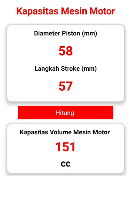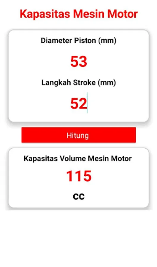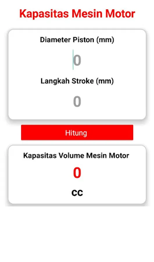 Application to calculate motor engine volume capacity based on piston diameter and stroke steps