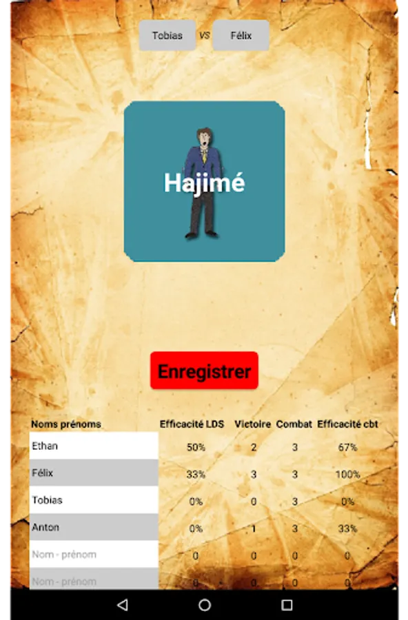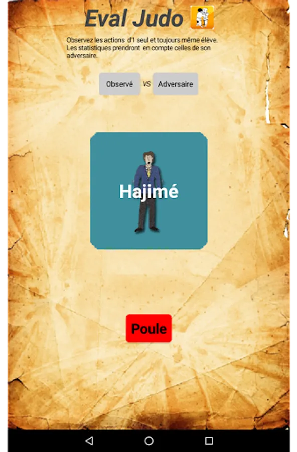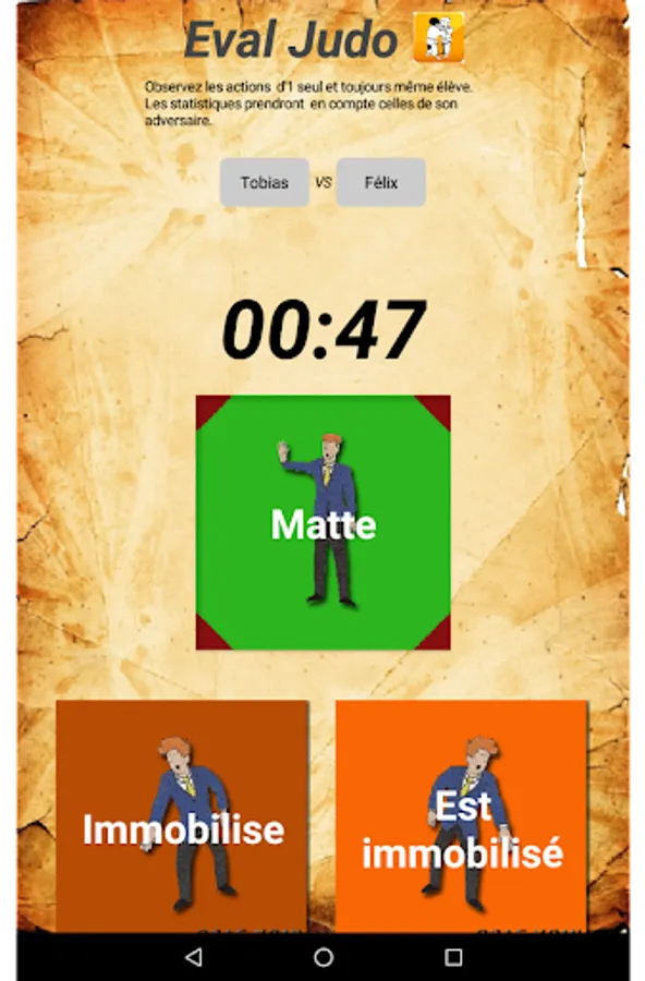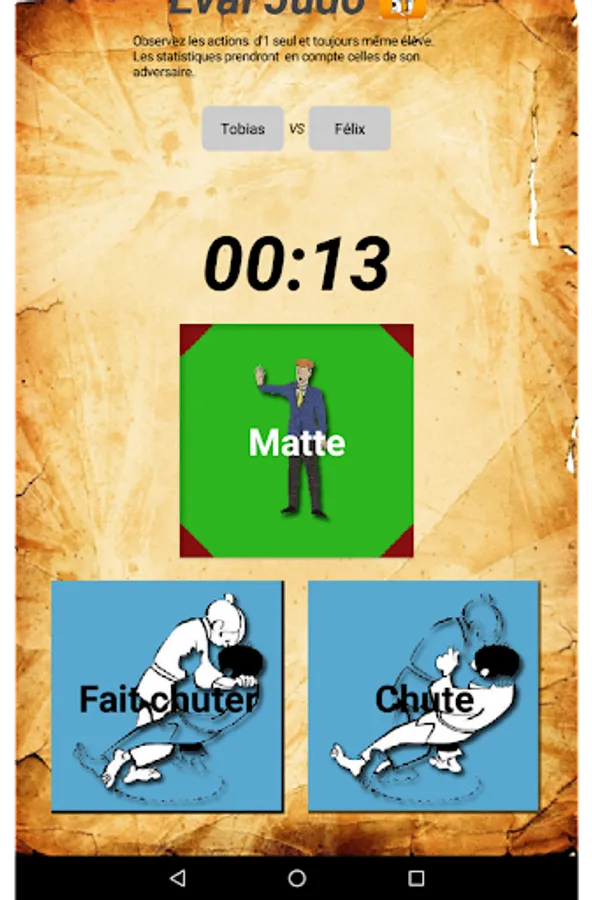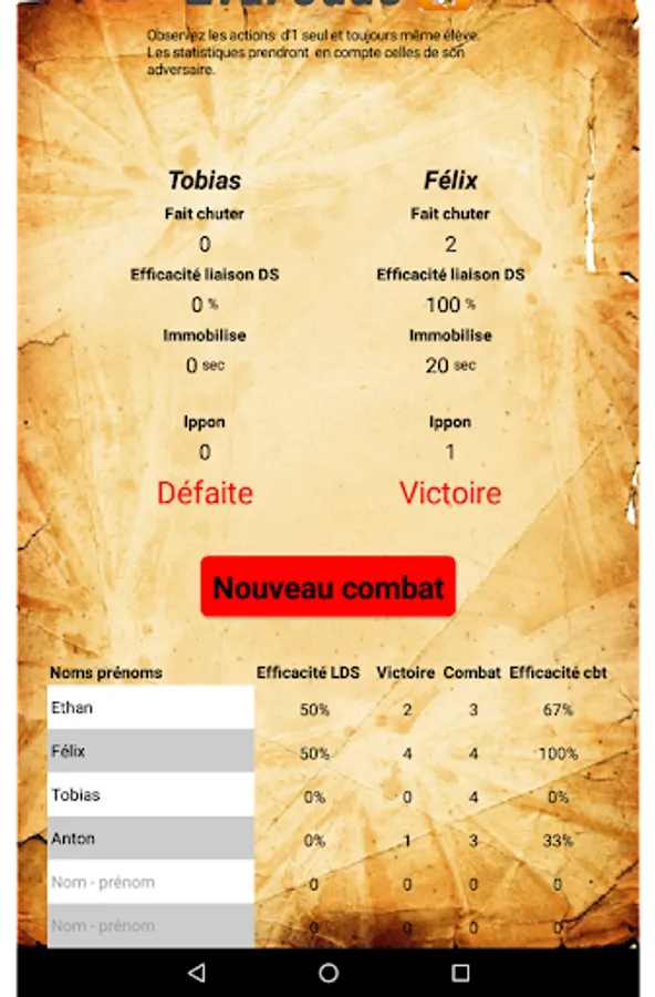 At the same time, a system for evaluating the knowledge and skills relating to refereeing aims to increase the accuracy of the statements since the statistics are only recordable if the fights are refereed by pupils who have reached the maximum score in the test. arbitration proposed by the application. Outside of this context, any fight will only have a training value (the statistics are displayed at the end of the fight but can not be memorized).