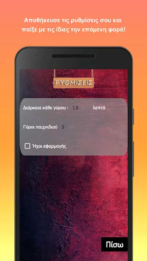 Select the rounds of each game, the duration of each round and the sound from the Settings menu.