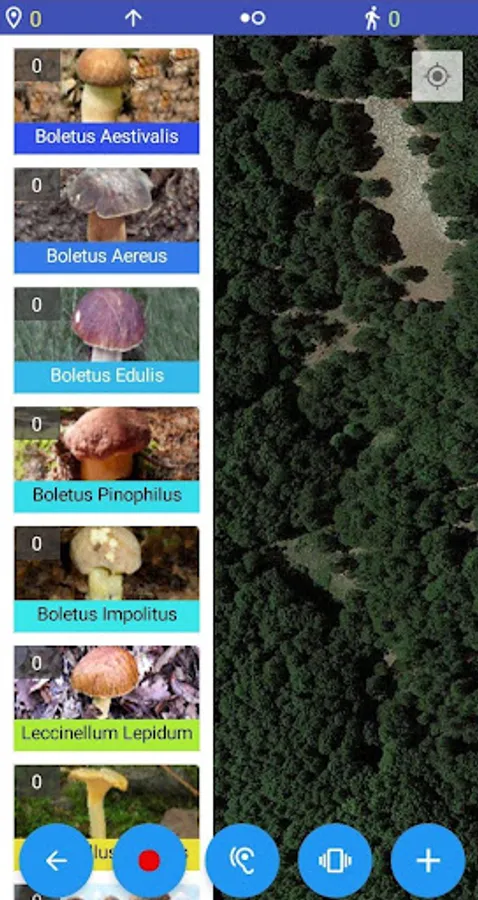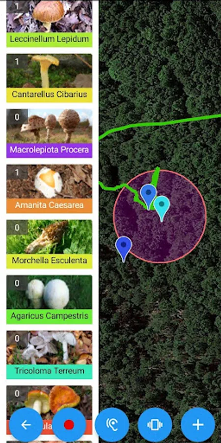 A simple click on the + button and from the list we choose the mushroom found, a marker will be placed on the map in the current position, with the same color as the mushroom label.