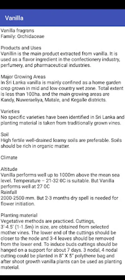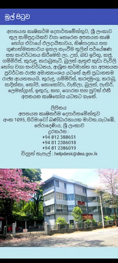 The Department of Export Agriculture (DEA) is the main government institution which comes under the purview of State Ministry of Development of Minor Crops including Sugarcane, Maize, Cashew, Pepper, Cinnamon, Clove, Betel Related Industries and Export Promotion, is responsible for the Research and Development by means of productivity, production and quality improvements of a group of perennial, Export Agricultural crops (EAC) namely Cinnamon, Pepper, Cardamom, Clove, Nutmeg, Coffee, Cocoa, Vanilla, Betel, Citronella, Lemongrass, Ginger, Turmeric, Goraka and Arecanut traditionally grown in Sri Lanka.