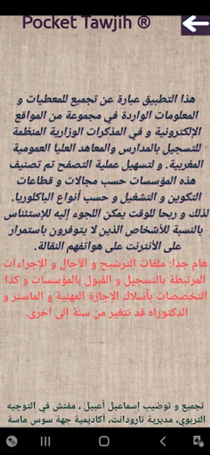 Hello. This application is a compilation of data and information received on electronic websites and ministerial notes on schools and Moroccan public higher institutes. It can be used for domestication for people who are not constantly available online on their mobile phones.