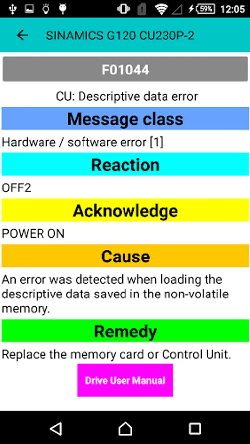 A Simple Siemens Drive fault finder for quick way to reference drive faults. It's easy to use. Lists all the fault codes and steps to solve the problem. Also has link to download the manuals.