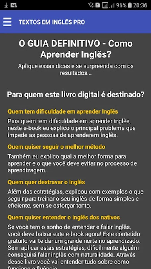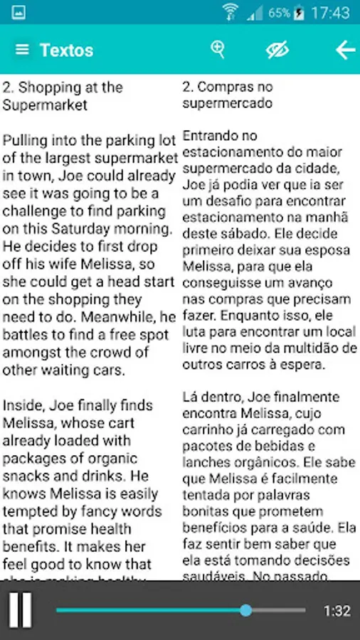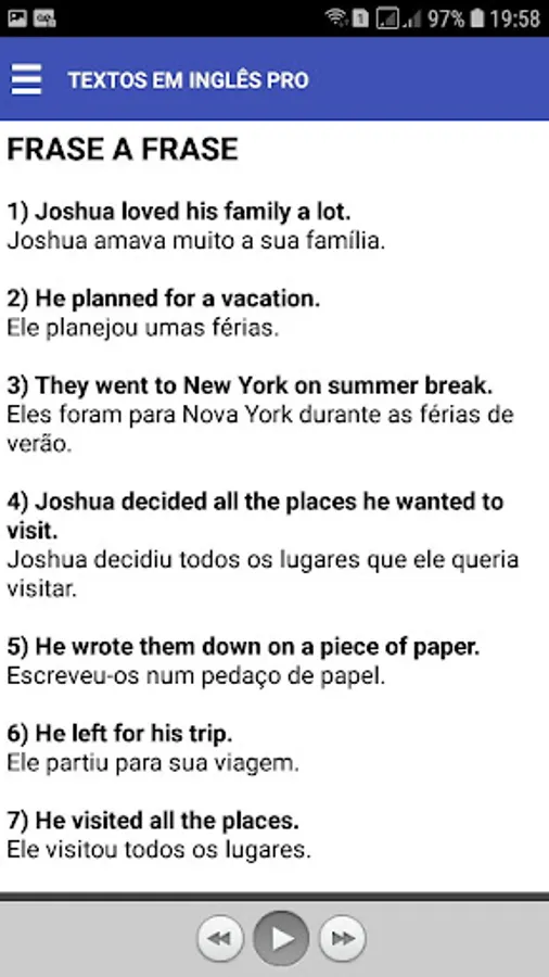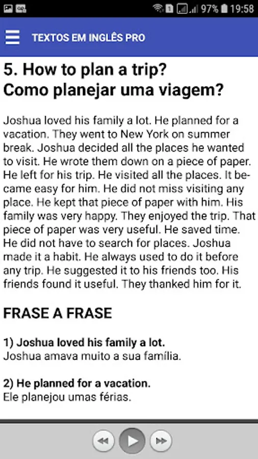 This application came to facilitate the study of those who learn English through texts. Without a shadow of doubt, learning English through texts is the best method one has to learn a language. Therefore, this application brings several English texts with audio and translation, addressing unusual stories that will increase your English language vocabulary considerably.