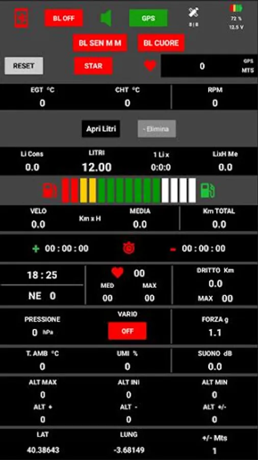 The Meter Engine is an application for mobile devices and tablets (on Android) that with sensors installed in our engine and connected via Bluetooth with the control unit, will indicate data of: EGT (Temperature Exhaust Gases), CHT (Culata Temperature - Spark plug), H2O (Agura Temperature - Refrigerant), RPM (revolutions per minute), Fuel consumption (Liters consumed, Liters in Storage, Consumption time 1 Liter, Liters per Average Hour, Fuel indicator by color, Current speed , Average Speed, Total Distance, Straight Line Distances, Time Positive Control (Time We Take), Negative Timer (The Time We Left According to the Storage Fuel), GPS or Sensor Heights, Accumulated Heights, Pressure, Variometer, Meter Force g, room temperature and humidity, sound meter, coordinates and more additional data.