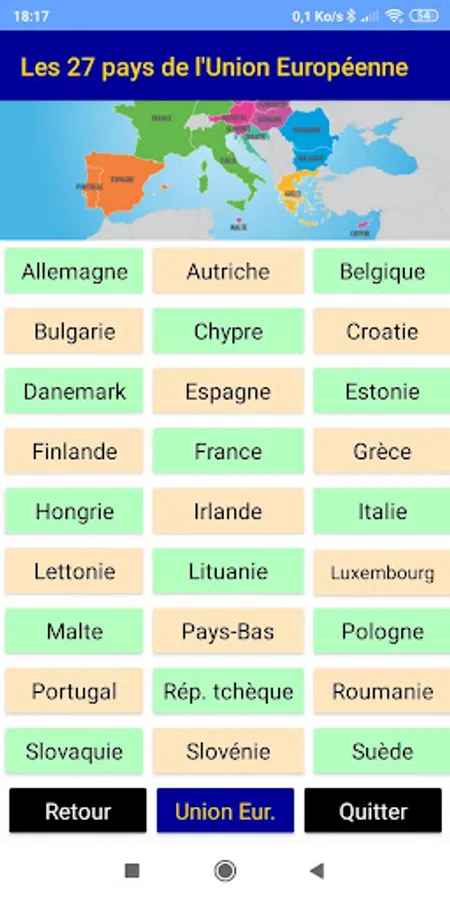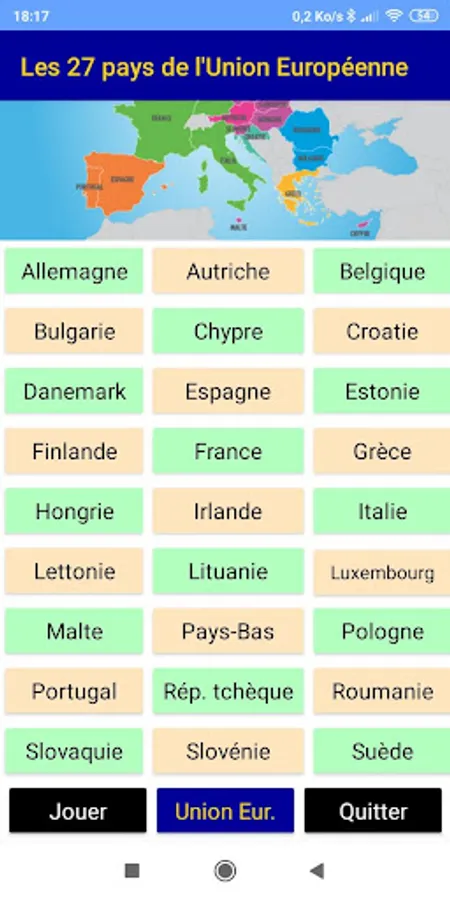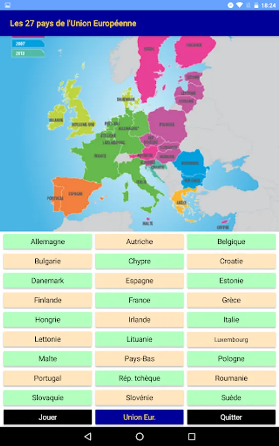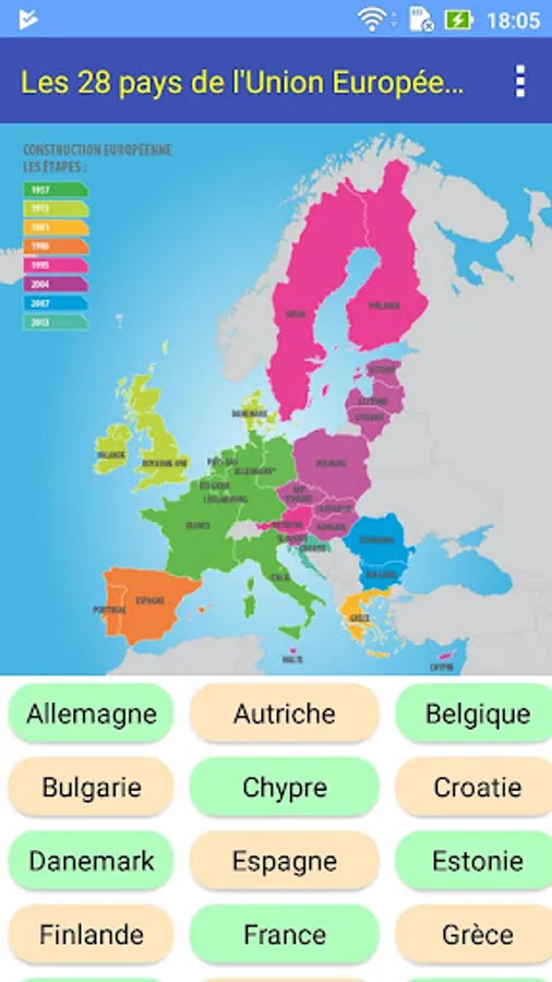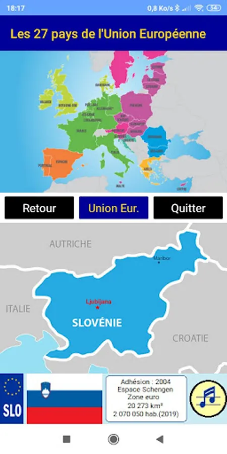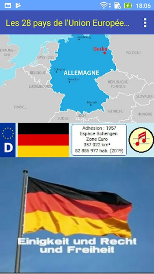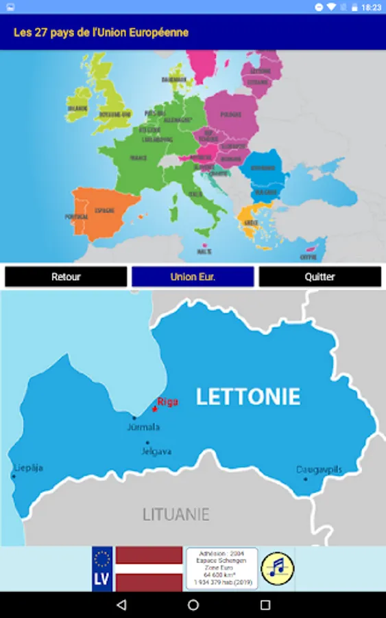 This app offers a better understanding of the 27 member states of the Union, by showing their map, their capital and main cities, their flag, their currency and some geographic data. It is possible for each country to listen to an extract from their national anthem.