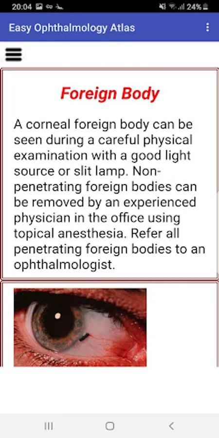 In brief, this application designed to have a quick review of ophthalmology. It covers the most common ophthalmic manifestations of eye diseases in your daily practice. It is recommended app for all ER doctors, general practitioners, Medical Students and who is interested.