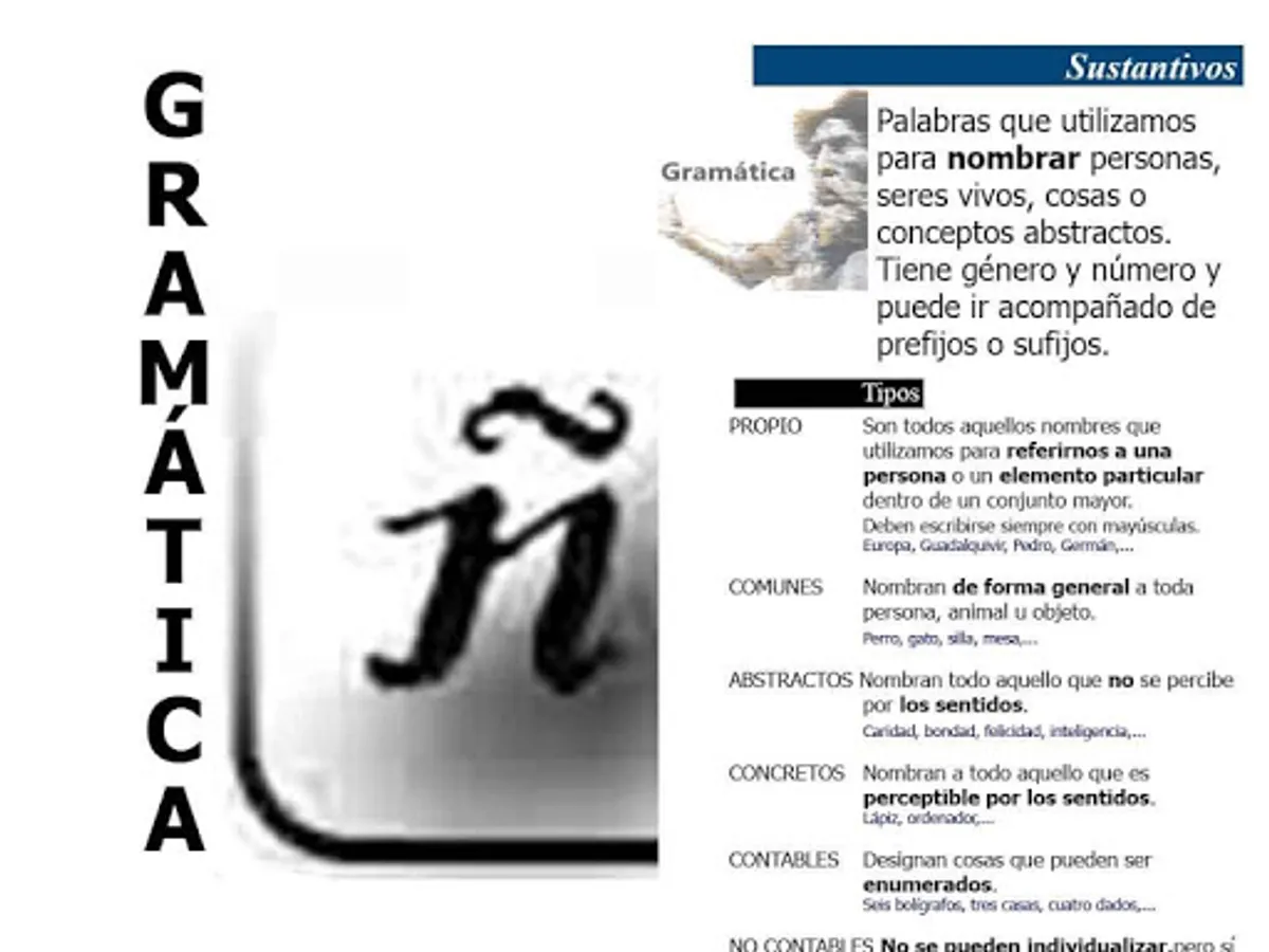 Application that studies the basic elements of the Spanish language and the combinations of the verb, the noun, adjective, diphthong, triphthong, hiatus, prepositions, interjections, the demonstrative, the sentence, the adverb, the adjective, the demonstratives, the possessives, the prefix, the suffixes and the accent, all accompanied by simple examples. Application focuses on mothers, fathers and students for a correct use of the written and oral language, without pretensions on our part.