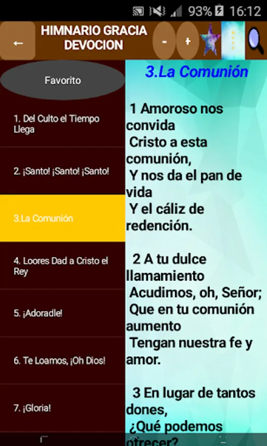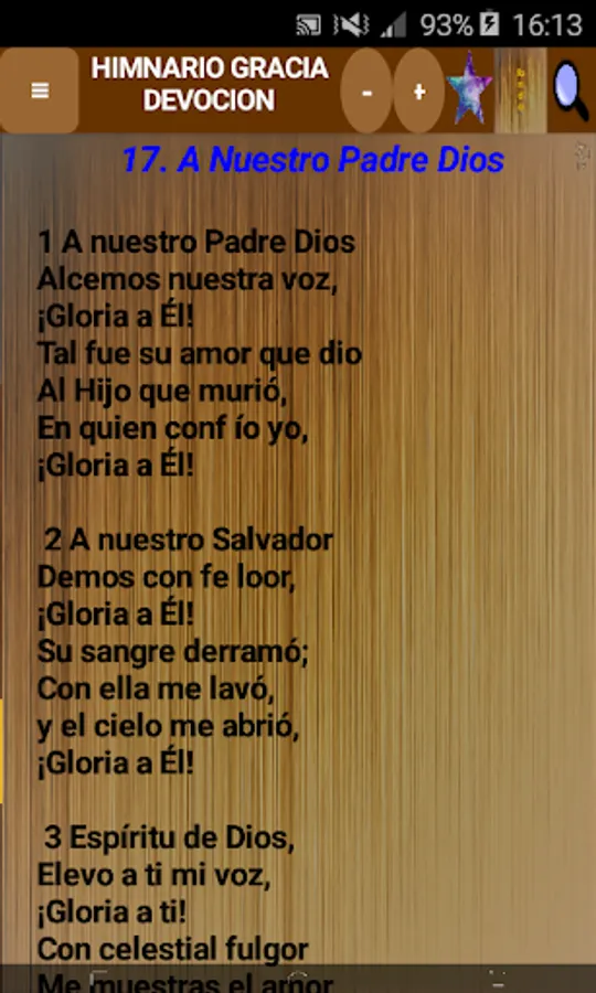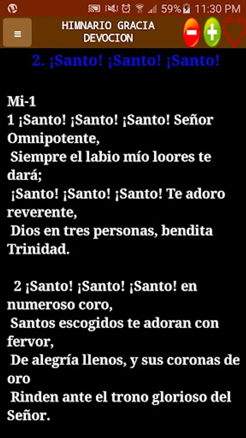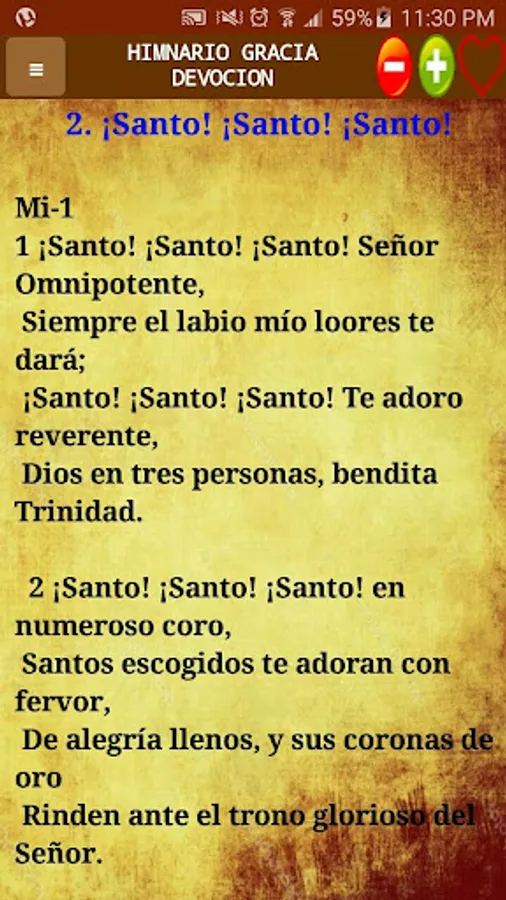 You will find all the hymns of the hymnal, you can modify the size of the letters and you can change the background color.