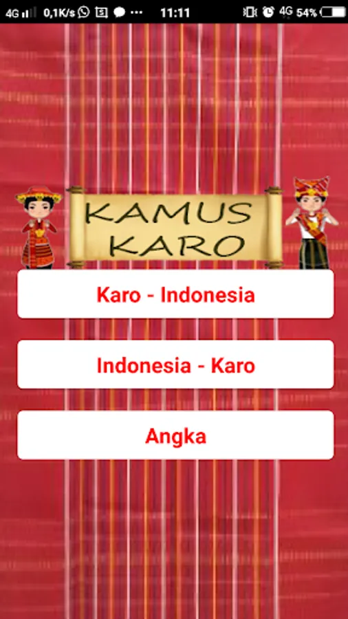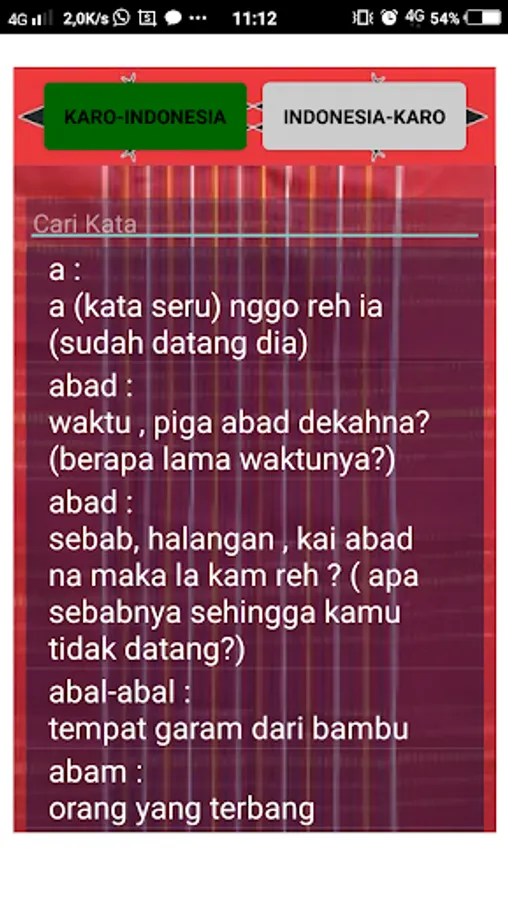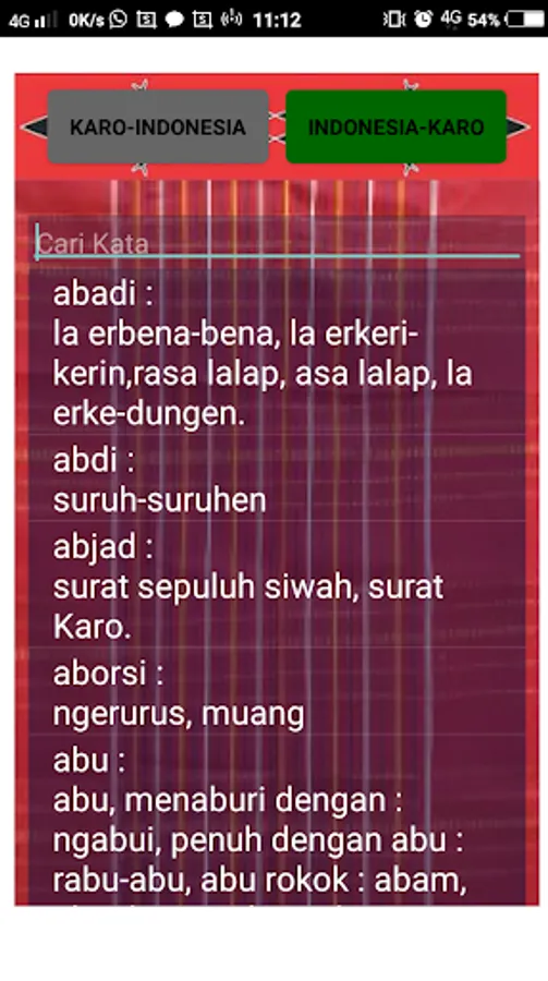 This Karo Dictionary application is useful for translating words from Karo into Indonesian and vice versa from Indonesian to Karo. There are around 7000 words that can be translated with this dictionary and some are accompanied by examples of sentences and translations.