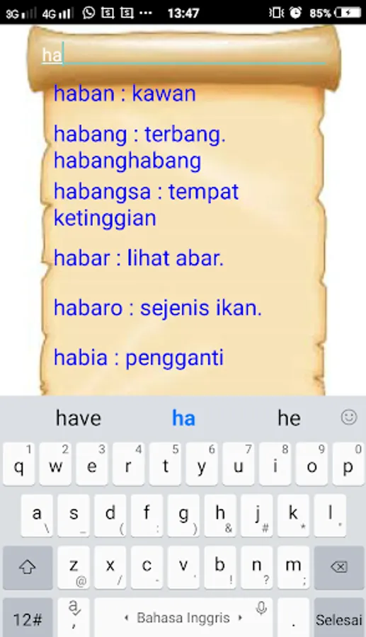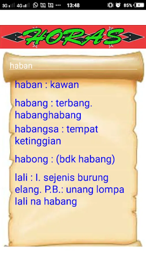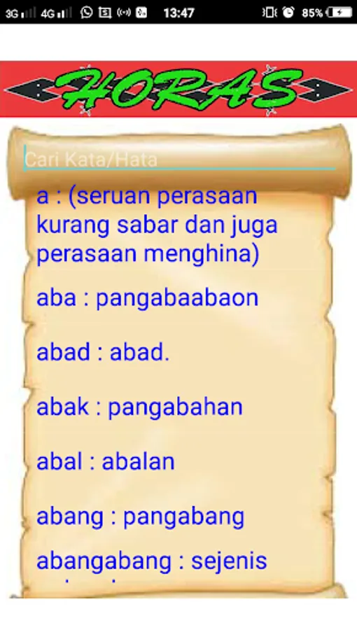 Indonesian Offline Batak Dictionary application is an application for translating Toba Batak languages / words into Indonesian and vice versa. Directly presented the word in the language of the Toba area and its translation, you can just swipe up to find other words or also can enter the words that are searched through the search box.