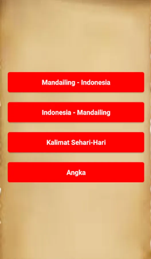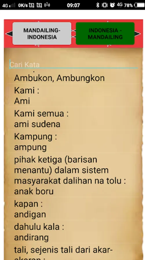 The Indonesian Mandailing Dictionary application presents word translations from the Mandailing Regional Language to Indonesian and vice versa. In addition there are also examples of everyday sentences commonly used in Mandailing and its translation.