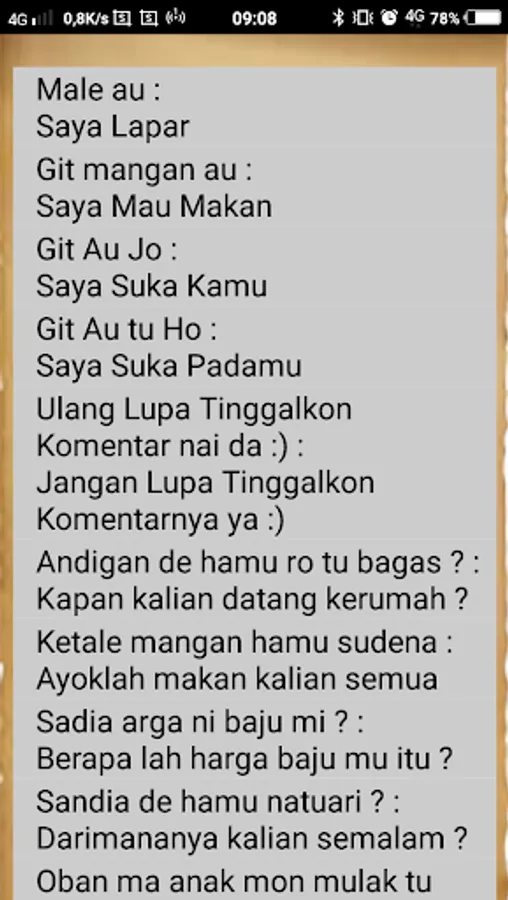 There is also a translation of numbers in the Mandailing language in this application. If you want to share you just press the choice of words or sentences that you want to share and a good choice will appear, copy, share via social media, email and other sharing applications contained in your mobile.