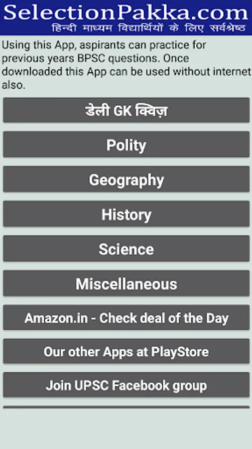 This App contains Bihar PSC (BPSC) previous years multiple choice questions. Practicing these questions will be very useful for exams conducted by BPSC.