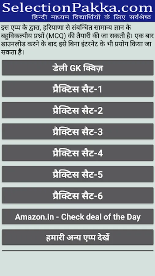 इस एप्प के माध्यम से अभ्यर्थी हरियाणा सामान्य ज्ञान के बहुविकल्पीय प्रश्नों का अभ्यास कर सकते हैं। एक बार डाउनलोड करने के बाद, इस एप्प का प्रयोग बिना इंटरनेट के भी किया जा सकता है।
