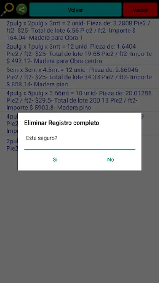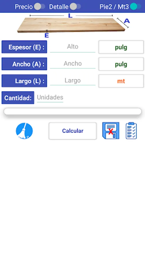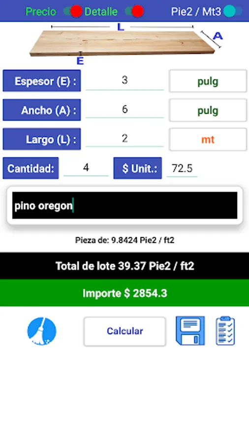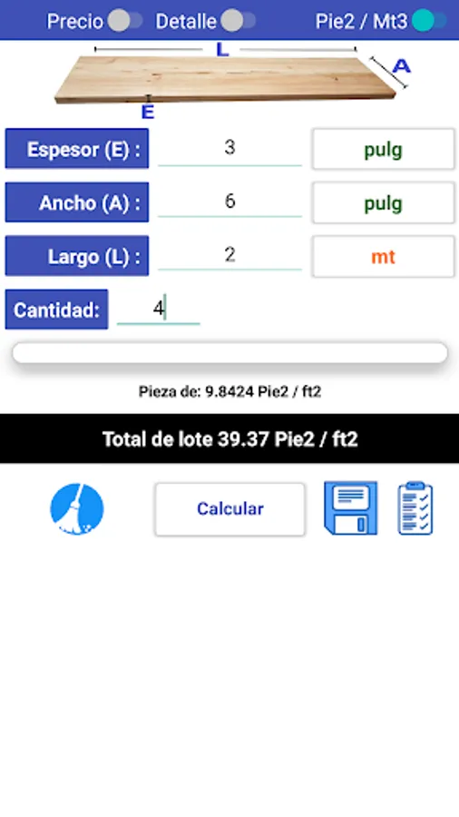 For this calculation, you must enter the thickness, width, length and quantity of pieces to obtain the unit and Total result of Pt / P2 / Ft2.