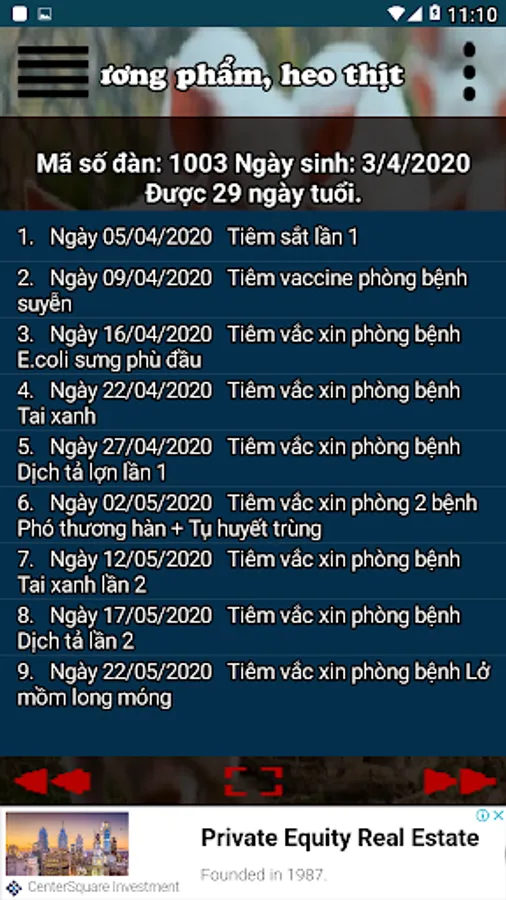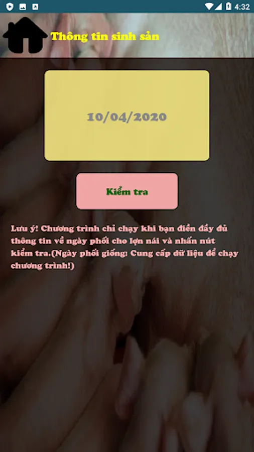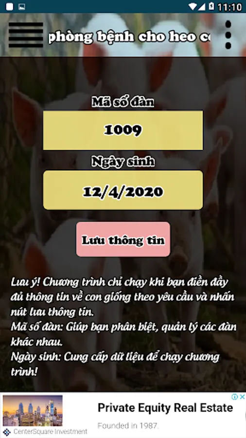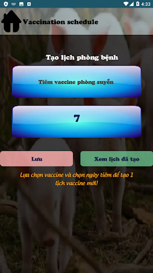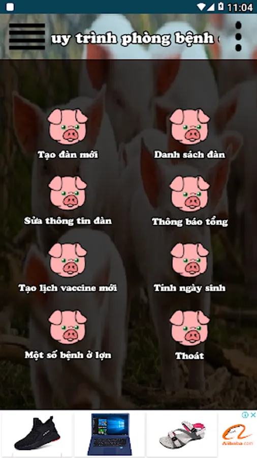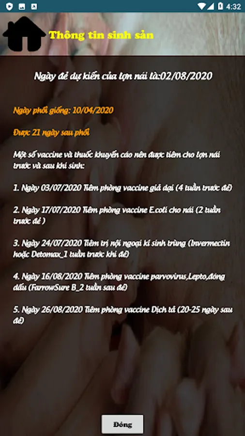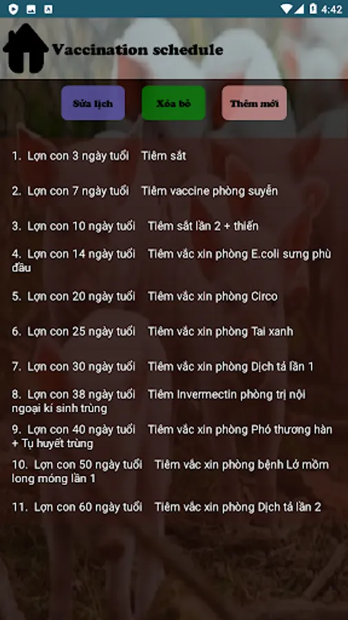 The application was created to help pig farmers can schedule disease prevention for commercial piglets quickly and stored directly on the phone. Help save time scheduling vaccinations, automatic notifications when the vaccine schedule for piglets. Update information about some common diseases during pig breeding, methods of prevention and treatment.
