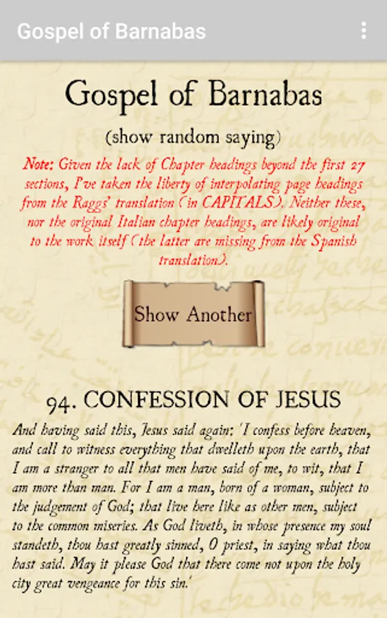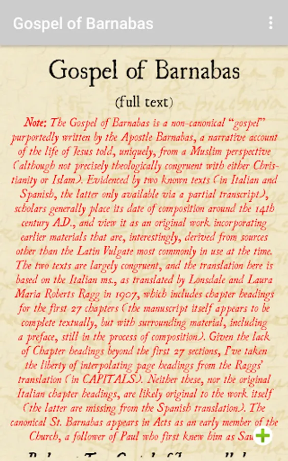 The Gospel of Barnabas is a non-canonical “gospel” purportedly written by the Apostle Barnabas, a narrative account of the life of Jesus told, uniquely, from a Muslim perspective (although not precisely theologically congruent with either Christianity or Islam). Evidenced by two known texts (in Italian and Spanish, the latter only available via a partial transcript), scholars generally place its date of composition around the 14th century A.D., and view it as an original work incorporating earlier materials that are, interestingly, derived from sources other than the Latin Vulgate most commonly in use at the time. The two texts are largely congruent, and the translation here is based on the Italian ms., as translated by Lonsdale and Laura Maria Roberts Ragg in 1907, which includes chapter headings for the first 27 chapters (the manuscript itself appears to be complete textually, but with surrounding material, including a preface, still in the process of composition). Given the lack of Chapter headings beyond the first 27 sections, I’ve taken the liberty of interpolating page headings from the Raggs’ translation (in CAPITALS). Neither these, nor the original Italian chapter headings, are likely original to the work itself (the latter are missing from the Spanish translation). The canonical St. Barnabas appears in Acts as an early member of the Church, a follower of Paul who first knew him as Saul.
