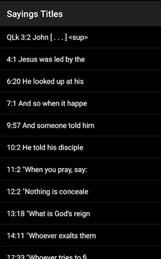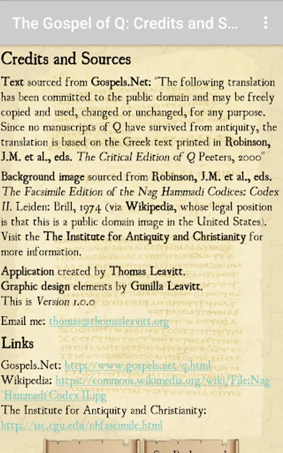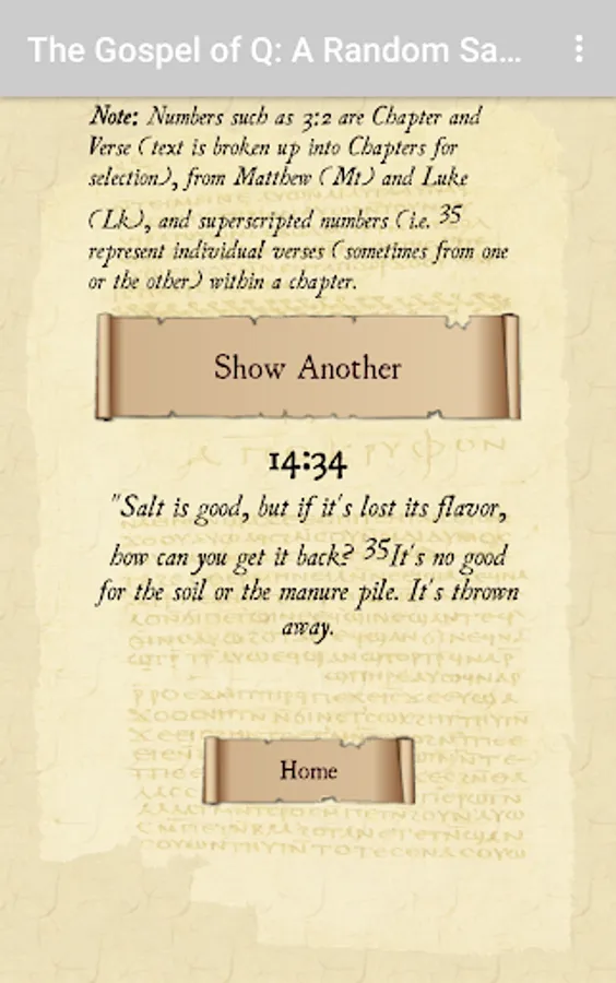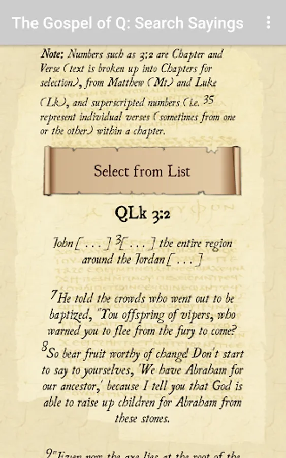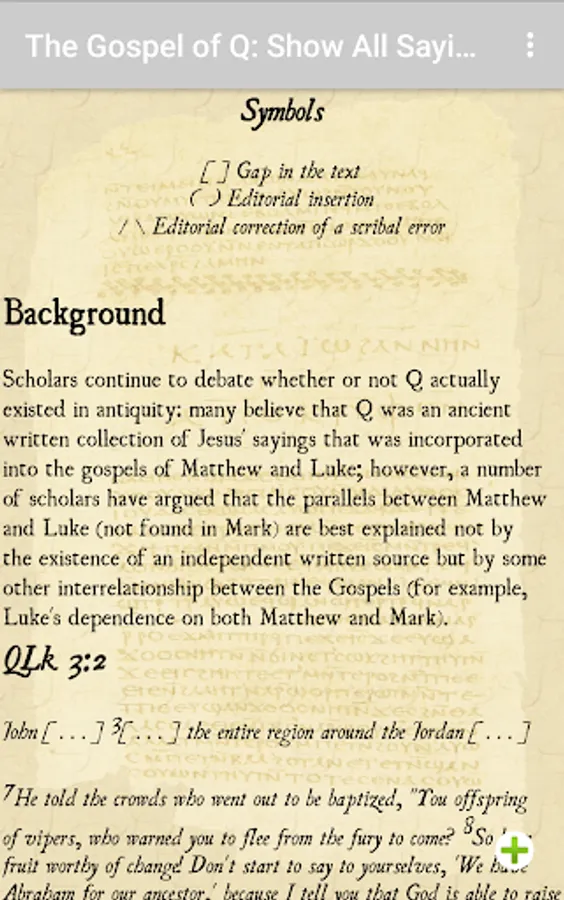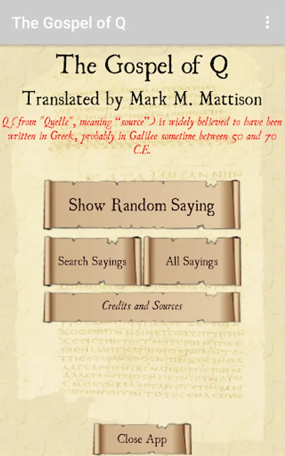 This app contains the full text of Mark M. Mattison's public domain translation of "The Gospel of Q" as published on Gospels.Net. The Gospel of Q is a hypothesized early Christian era document (50 to 70 CE) that some scholars argue provided a common source for the composition of the Gospels of Matthew and Luke (along with other material, including the Gospel of Mark). This is known as the "Two Source Hypothesis". The version published here has been meticulously reconstructed by respected Biblical scholars using elements common to both gospels. Sayings are grouped by Chapter, with the original verses from the biblical gospels noted in superscript.