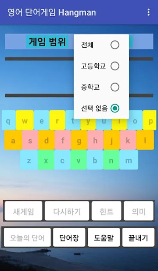 The game range is divided into current middle school words, high school words, and full words (including middle school + high school + more).