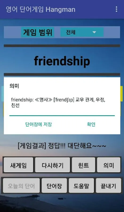 4) By clicking the [Meaning] button, detailed information such as part of speech, pronunciation symbol, and meaning of game word can be viewed, and words desired by the user can be added to the wordbook. Depending on the cycle, it will be automatically provided to the user (by app) as a review word after 1 day, 7 days, and 30 days.