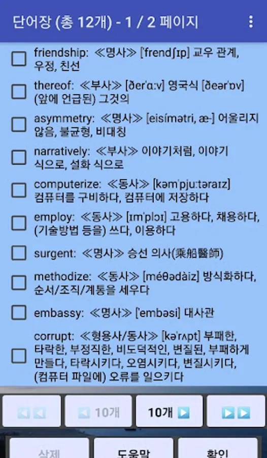 6) If you click [Wordbook] button, you can see all the words stored in the wordbook until after installation of the app, and edit such as deletion is possible. The deleted word disappears from the wordbook, but it remains in the DB which manages the review range and the review cycle, so you can see it when the review cycle comes (only after 30 days) This button is useful when reviewing or reviewing at a glance.
