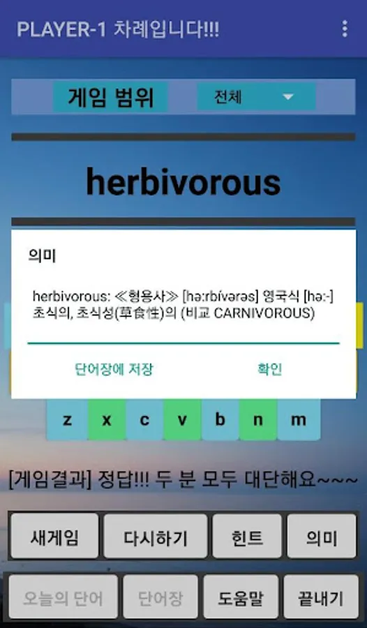 4) By clicking the [Meaning] button, detailed information such as part of speech, phonetic symbol, and meaning of the game word can be viewed and words desired by the user can be added to the wordbook. Depending on the cycle, it will be automatically provided to the user (by app) as a review word after 1 day, 7 days, and 30 days.