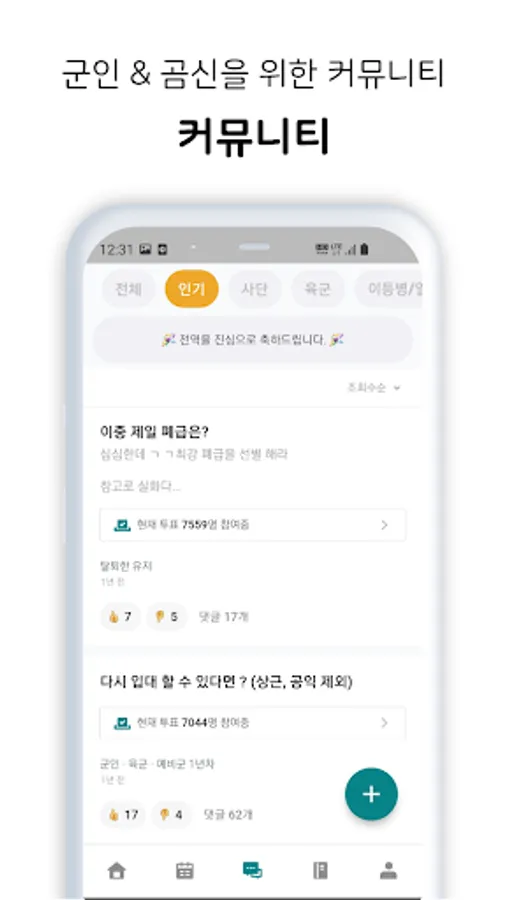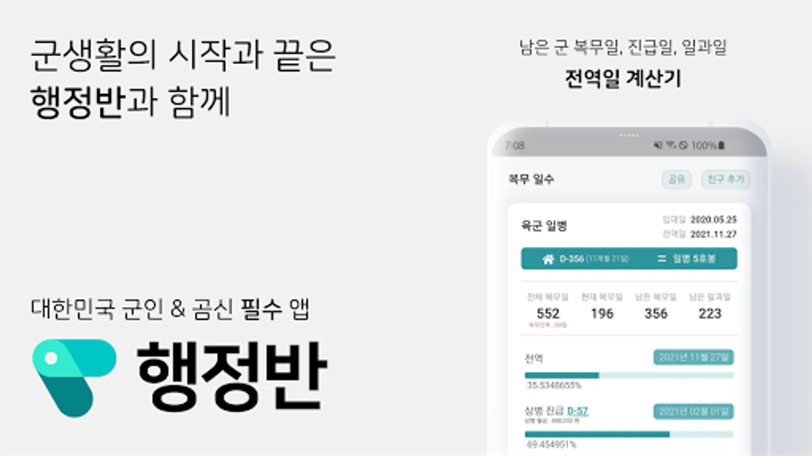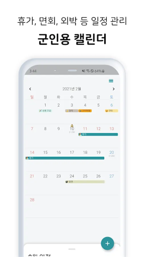 Variety of functions for soldiers, such as combat date calculator, unit review, soldier community, soldier calendar, vacation management, diary, military meal information provision, couple interlocking, salary & savings management function!