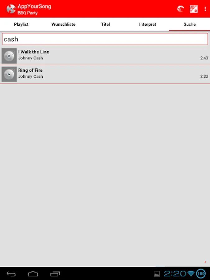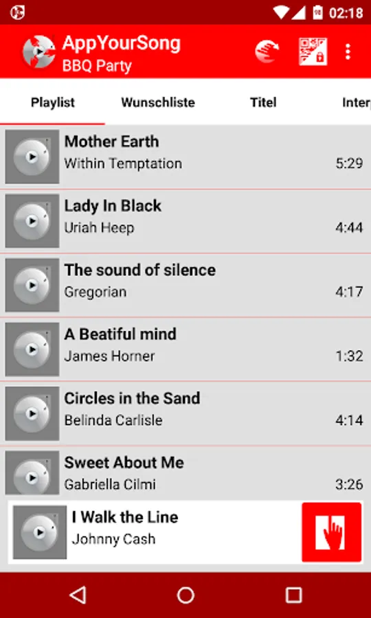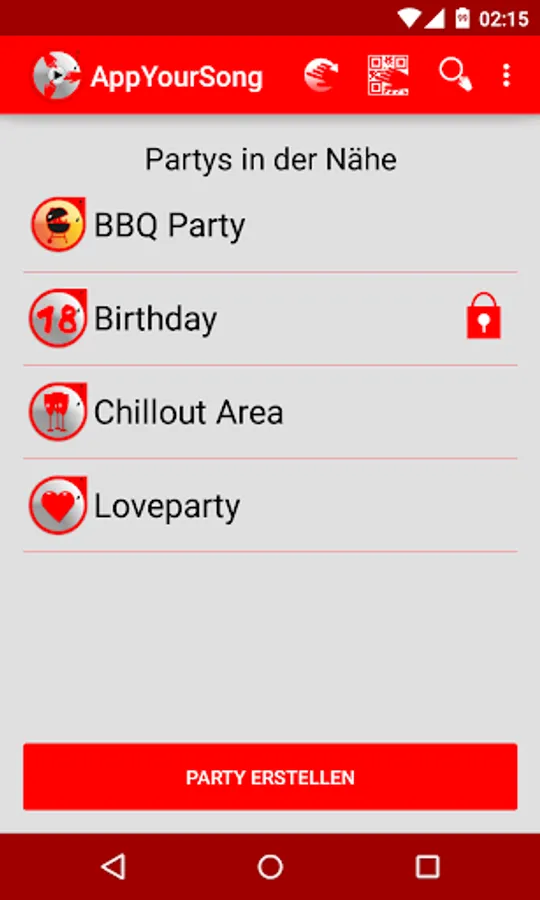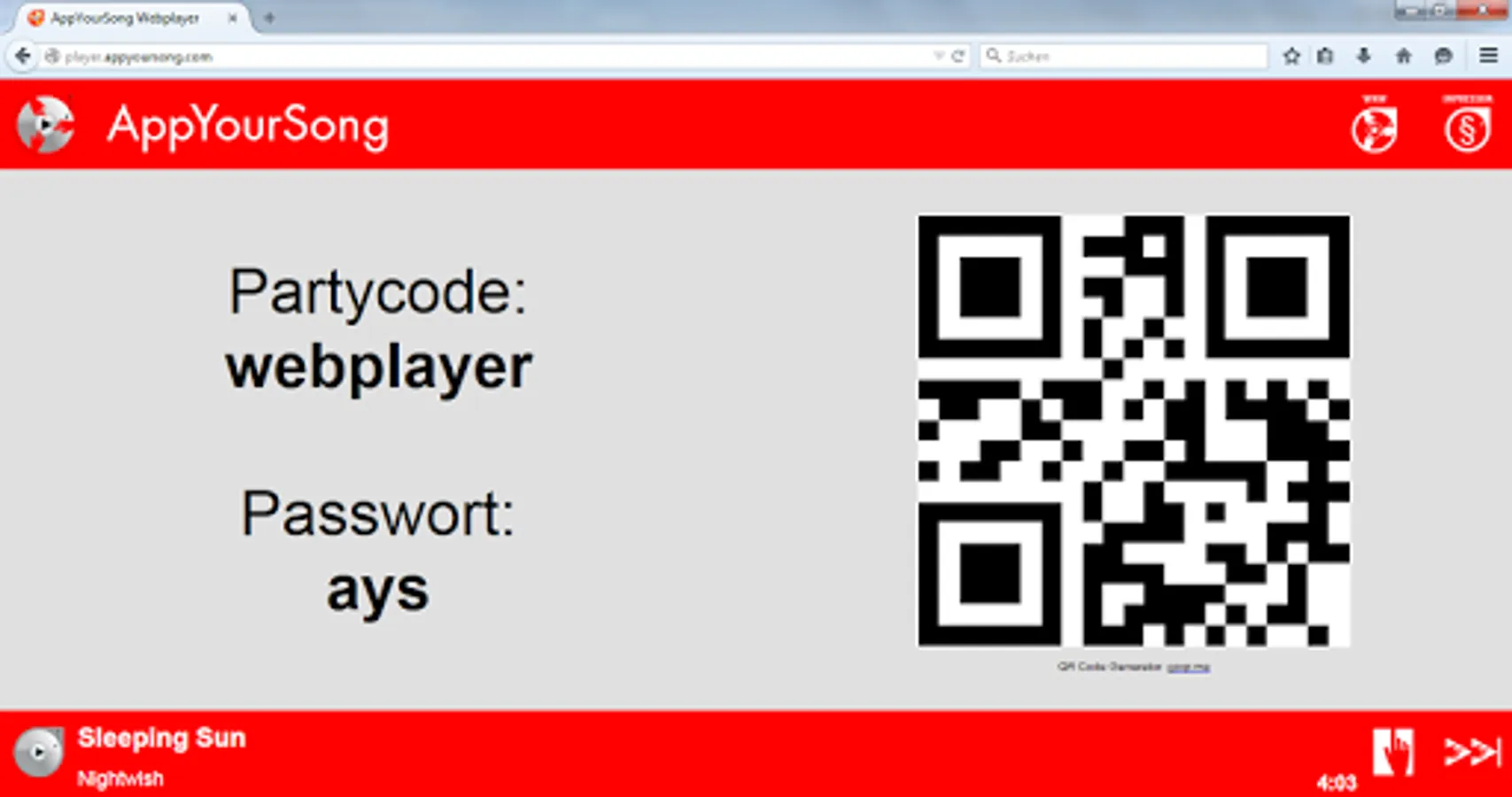 AppYourSong automatically shows you all parties in your surroundings. As a guest just select your party and you can start. You can also search manually for the party name or ask your host to use the app to generate a QR-code to the party. This QR-code also encodes the password, if it is a secured party. If you choose a secured party manually, ask your host for the password. Guests can alter their requested songs in the wish list as long as a song is not played yet.