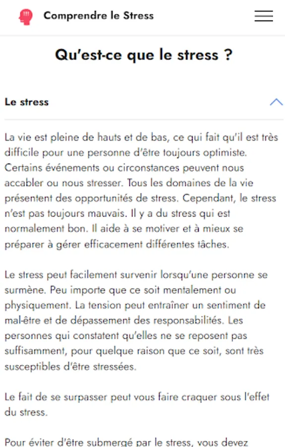 "Understanding Stress" is an application for managing stress on a daily basis. With six chapters, it covers the different types of stress, stress factors, effects of stress, techniques to eliminate and avoid it.